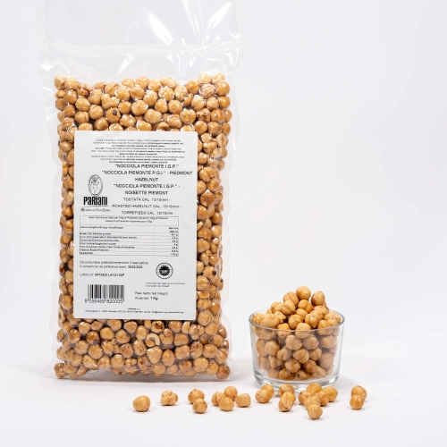 Biologische Piemonte hazelnoten van de variëteit "Tonda Gentile Trilobata", beschouwd als de beste ter wereld qua smaak, aroma en houdbaarheid. Herkomst wordt gegarandeerd door de PGI-certificering (Beschermde Aanduiding van Oorsprong). Het roosteren verbetert de smaak en het aroma. Ideaal ter decoratie voor taarten en gebak en als ingrediënt voor noga. Daarnaast voor chocolatiers interessant als element in repen, pralines, bonbons, truffels en als basis van een dragee.