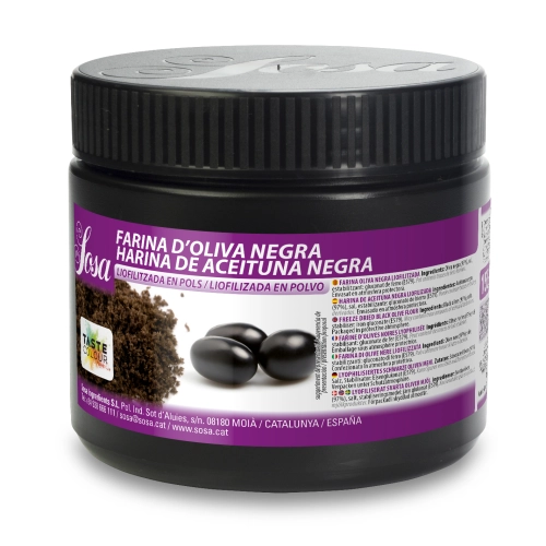 Gevriesdroogd zwarte olijf poeder dat 100% natuurlijk is. Perfect voor het toevoegen van smaak en kleur aan bijvoorbeeld chocolade, cacaoboter, macarons, meringue, ijs, sauzen en dressings.