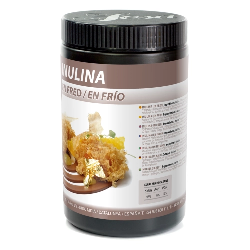 Inuline Koud is een voedingsvezel afgeleid van fructose gewonnen uit wortels en knollen. Het beschikt over de eigenschap om gels te vormen die een grote hoeveelheid water vasthoudt. Het mengsel hydrateert in koude toestand na turbo mixen van 1 minuut en erna 12u rusten in de koelkast. Kan worden gebruikt als vetvervanger in mousses, roomijs en vetvrije creams voor goede textuur.