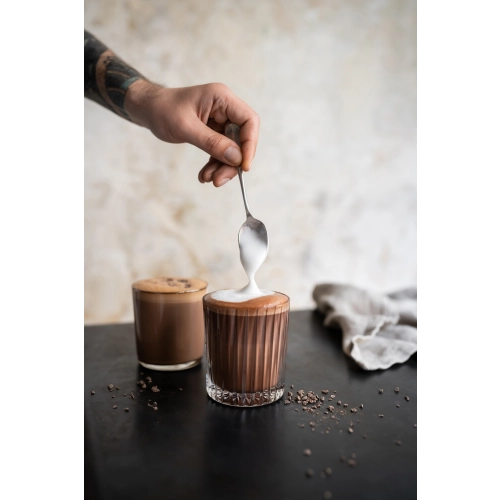 Maak met dit chocoladeschaafsel afkomstig uit Ghana een chocolademelk met karakter. Een pure origines uit Ghana geeft een krachtige smaak welke eenvoudig te bereiden is. Voeg aan 30 gram schaafsel 100ml koemelk of 120 ml haverdrank toe en verwarm het ongeveer 15 seconden met een stoompijpje. Doordat de chocolade een schaafsel is smelt het eenvoudig tijdens dit proces en kun je de chocolademelk serveren.