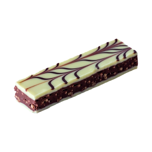 Bouchée van ongeveer 35 gram. Deze reep heeft een vulling van pure gianduja met crispy granen stukjes. Omhult met een laagje witte chocolade maakt het deze reep af.