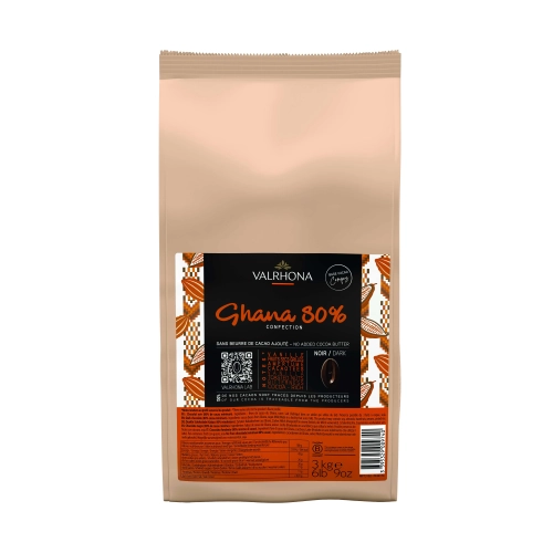 Ghana is al sinds het begin van de 19e eeuw een regio waar cacao wordt verbouwd. Tijdens hun verkenning van het land ontdekten onze inkopers de toewijding waarmee de spelers in de cacaosector de homogeniteit en kwaliteit van de grondstoffen verdedigen. Sindsdien hebben ze een nauwe band onderhouden met lokale telers om onze single origin chocolades de beste cacao te bieden. Met Ghana 80% onthult Valrhona de typische aroma's van cacao die op Ghanese plantages worden verbouwd, met zijn tonen van vanille, geroosterde noten, bitterheid en cacao. Maar dit is slechts een deel van Valrhona's Ghanese verhaal. In deze krachtige chocolade is geen cacaoboter toegevoegd, wat het een ideale chocolade maakt voor krachtige mousses & ganaches.