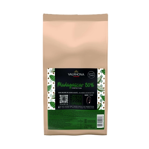 De krachtige aroma's en karakteristieke smaak van de Madagaskische cacaobonen, ontdekt door onze inkopers, komen tot uiting in deze single origin chocolade. Valrhona brengt het terroir van Madagaskar naar voren met de pittige bessentonen, geroosterde noten en de bitterheid van Madagaskar 80%. De naam weerspiegelt het authentieke aromatische profiel van cacao van het rode eiland en de krachtige smaak die wordt versterkt door het hoge cacaogehalte. In deze krachtige chocolade is geen cacaoboter toegevoegd, wat het een ideale chocolade maakt voor krachtige mousses & ganaches.
